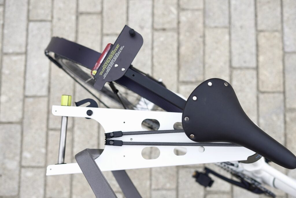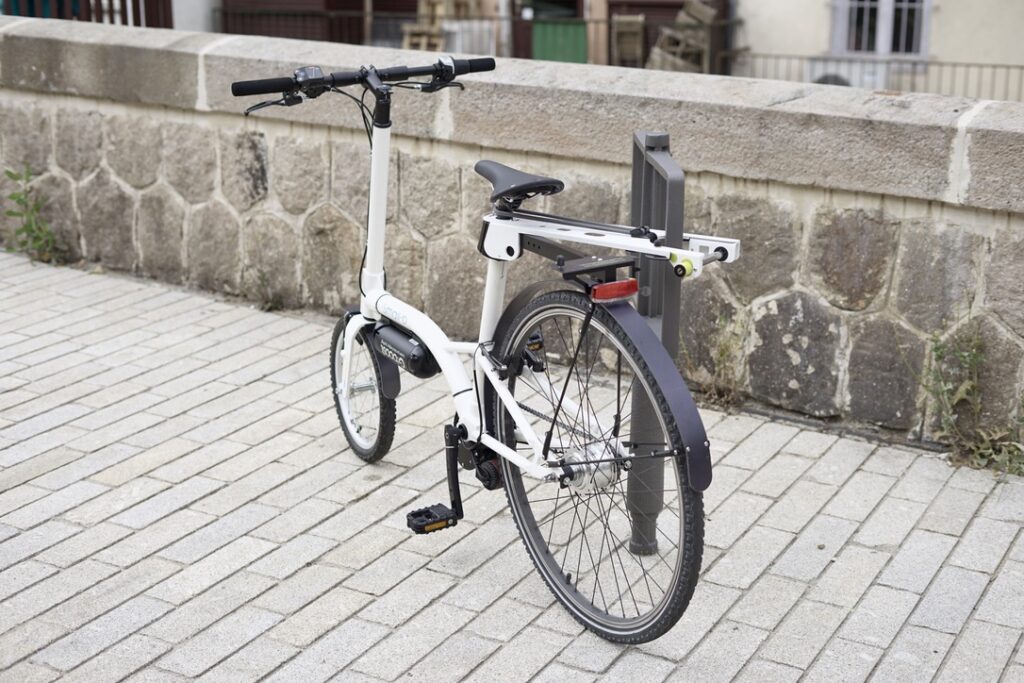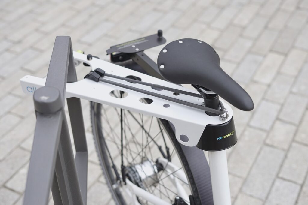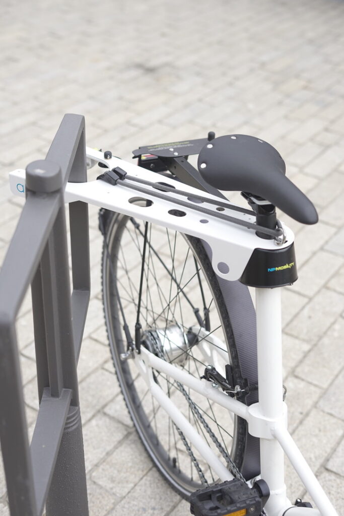 La partie porte bagage pivote vers la droite, et vous permet d’attacher votre vélo à un mobilier urbain ou à tout autre objet solide.
